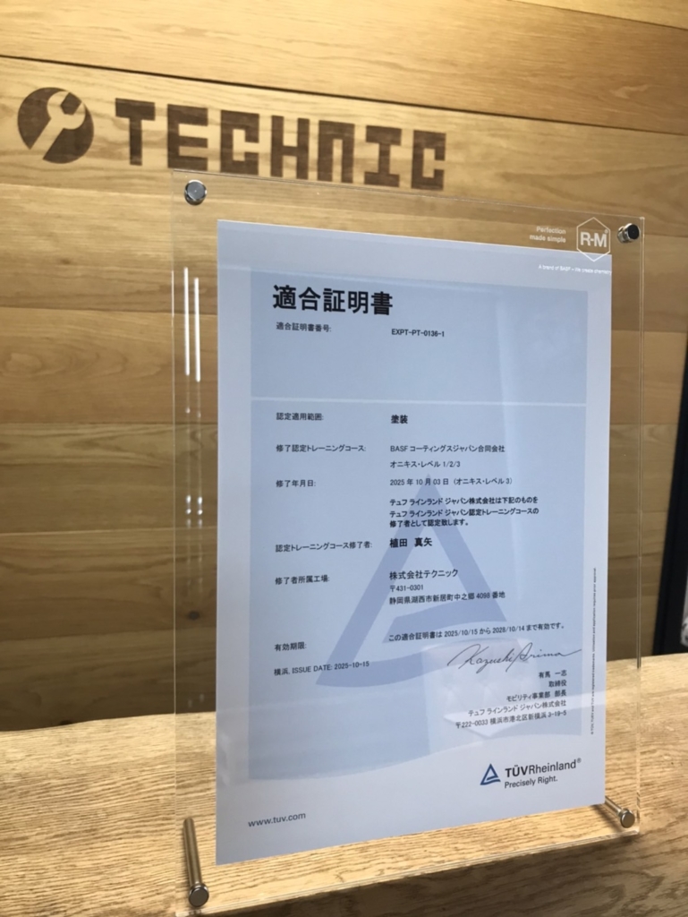 この度弊社スタッフ植田が、テュフ ラインランド ジャパン株式会社より、塗装技術に関する「BASFコーティングオニキスレベル1/2/3」の修了者として認定されました。
